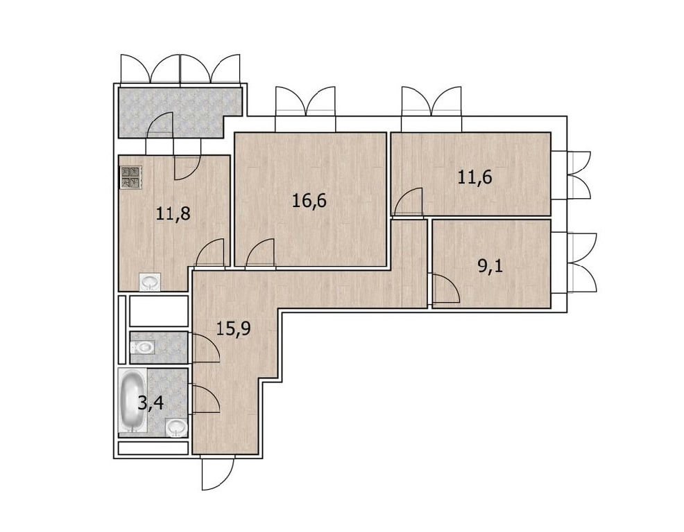 Комнаты: 16.6-11.6-9.1 м2